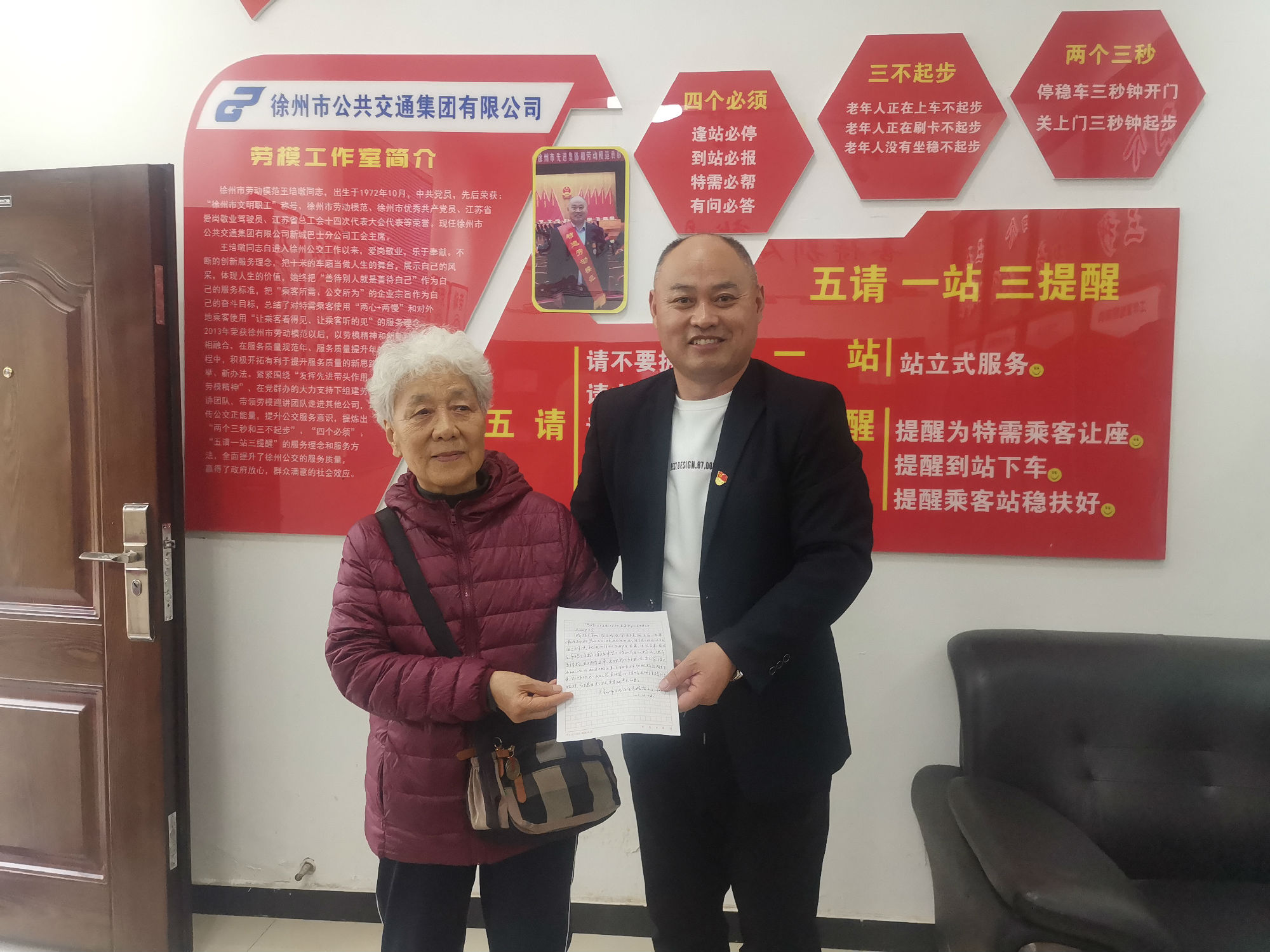 10月28日下午,一位滿頭銀發(fā)的老人拿著一封親手寫的感謝信來到了徐州公交新城公司,老人說:“有一位駕駛員,經(jīng)常幫助我和老伴,但我不知道他叫什么,只知道他在46路2750號公交車?!苯?jīng)核實,正是46路公交駕駛員郭開明師傅。