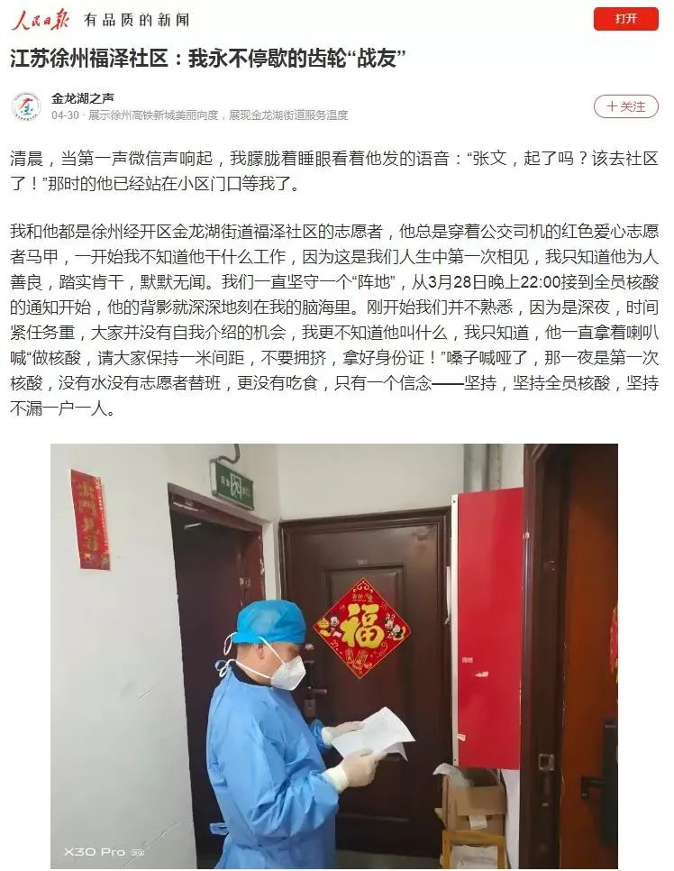 今年3月底,疫情在徐州蔓延,徐州公交停運。鹿偉積極響應(yīng)號召,在經(jīng)開區(qū)金龍湖街道福澤社區(qū)做起了防疫志愿者,測溫、登記、消毒,只要是需要的地方都可以看到他忙碌的身影。在全員核酸檢測的進程中,福澤社區(qū)部分工作人員因接觸密接人員而被隔離,志愿者便擔負起各個核酸點位的工作。從那時起,鹿偉便總是早晨第一個來,晚上最后一個走。全員核酸一輪接一輪,不管安排什么工作,他每天都如約而至,從不遲到,從不停歇。而他口中永遠都只有一句話:“只要沒開工,我就天天干,開工了我就要上班去。”多么淳樸的一句話,簡潔明了,可是,卻無不透露著他內(nèi)心深處的干凈、純粹、無私、大愛、無怨無悔。很多人會問他為什么這么堅持不懈,是什么讓他這樣干勁十足,他的回答一直都是:“我喜歡付出,我覺得這樣活得很踏實、很充實,家里人也很支持我。”